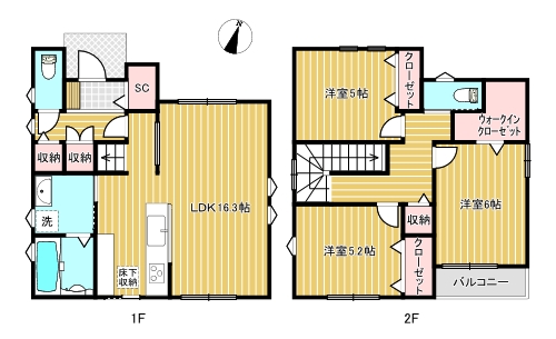 | 間取内容 | LDK12.9畳 1階 洋室4.5畳 2階 洋室5畳 2階 洋室5.2畳 2階 | ||