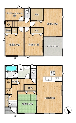 間取内容 LDK15畳 1階   和室5.2畳 1階   洋室5.7畳 2階   洋室5.7畳 2階   洋室7.7畳 2階   その他3畳 2階