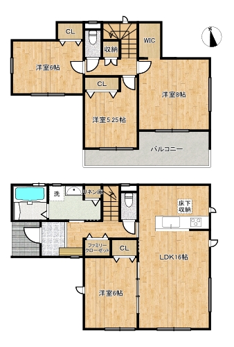 | 間取内容 | LDK16畳 1階 洋室6畳 1階 洋室5.25畳 2階 洋室6畳 2階 洋室8畳 2階 | ||