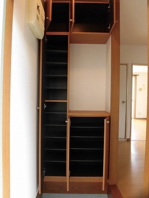 まず玄関ドアを開けると、正面にシューズボックスがあるのですが天井の高さまで収納があるので周りはスッキリ出来そうです。靴をたくさん持っているかたも安心♪