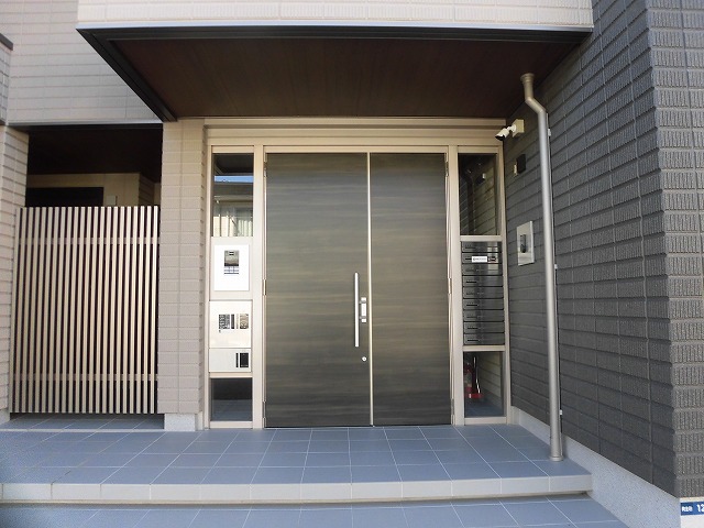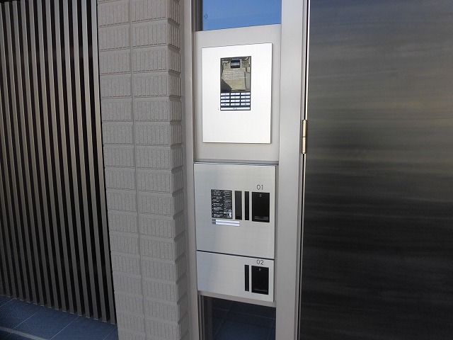 共用エントランスには、オートロック・防犯カメラがあります。また宅配ボックスも設置されています。共用玄関内に入ると、エレベータもあります。