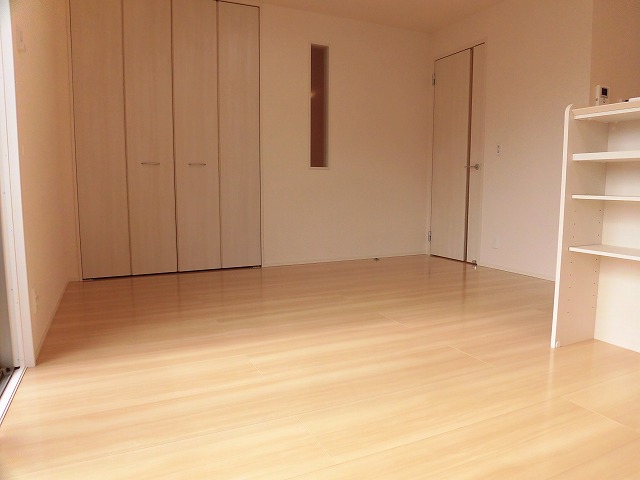 そして6帖の洋室についてです。このお部屋にもエアコンがあるので快適に過ごせますね。また、備え付けのウォークインクローゼットは両サイドにパイプハンガーあり、掛ける収納がしっかりとできて整理整頓も出来そうです。同時に、角部屋なので北側南側東側に窓があり、風通しも良いお部屋です。