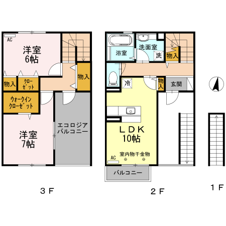 203号室は中部屋です。2階には水回りと10帖のリビング、内階段を上がった3階には2つの洋室とインナーバルコニー(エコロジアバルコニー)があります。