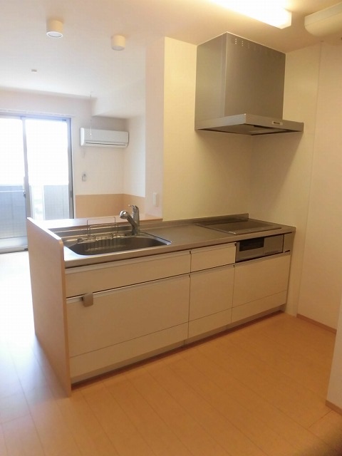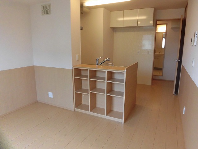 まずリビングはキッチンは広めですが、少しコンパクトな印象です。IHクッキングヒーター付きのシステムキッチンは収納力もあるので使い勝手は良さそうです。また、エアコンと室内物干しも設置されています。