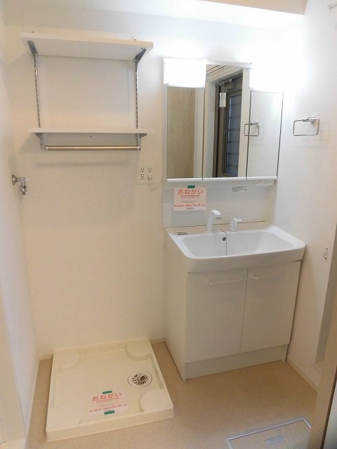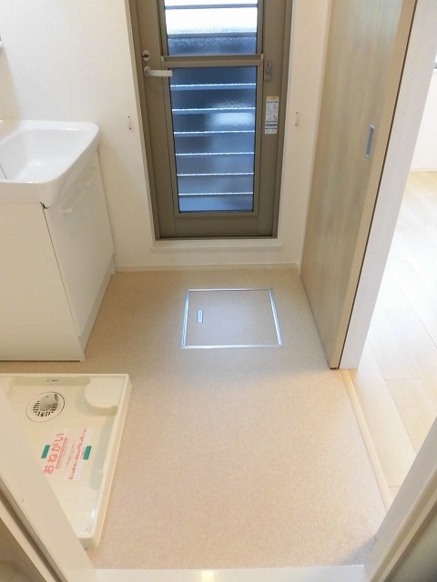次に洗面はリビングからつながっております。洗面台はシャワー付き・室内洗濯機置き場・浴室は追炊きと浴室換気乾燥機付きとなっております。