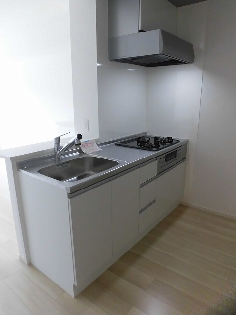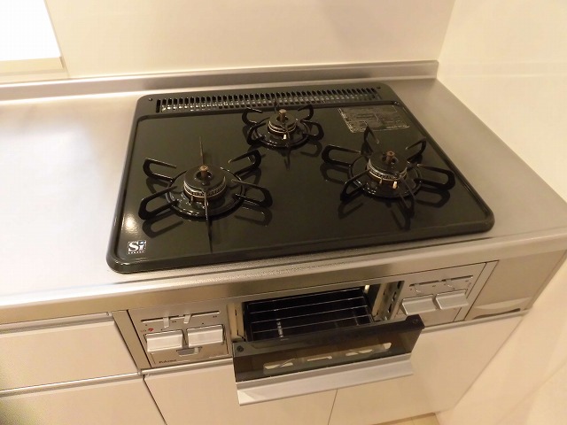 まず、3階まで上がるとホールのところに温水洗浄便座機能付のトイレがあります。その先がリビングとなっており、11.9帖の広さです。キッチンは3口ガスコンロ付きのシステムキッチンで対面式となります。南向きで日当たりが良いです。また、キッチン横にウォークインクローゼットがあるのはとっても素敵です!