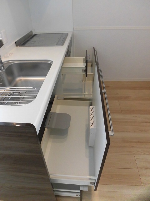 まずリビングについては、落ち着いた色合いのフローリングで清潔感があります。またキッチンは、IHクッキングヒーター付きのシステムキッチンとなっています。スライド収納で使い勝手も良さそうです。さらに南側だけでなく西側にも小窓があり、明るい室内になっています。