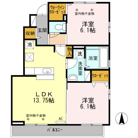 | 間取内容 | 洋室6.1畳 洋室6.1畳 LDK13.75畳 | ||