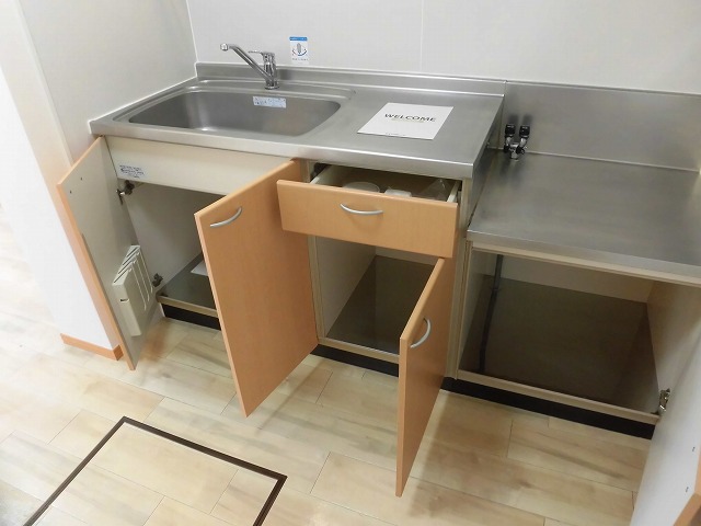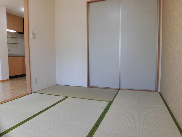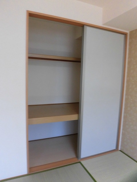 まず、ダイニングキッチンは9帖の広さです。角部屋のため、西側にも小窓があります。またキッチンには床下収納があり備蓄庫としても役に立つと思います。次に南側和室には奥行のある押入があります。キャスター付きのタンスなどを入れると使い勝手も良くなるし、お部屋も広く使えるのではないでしょうか。