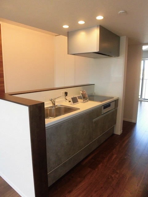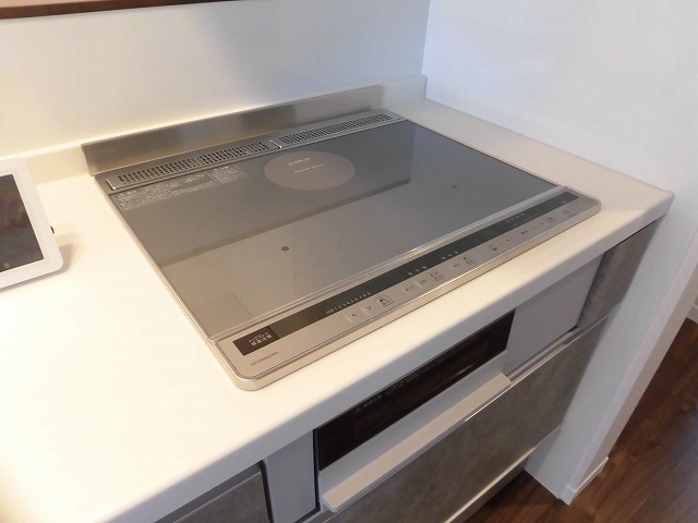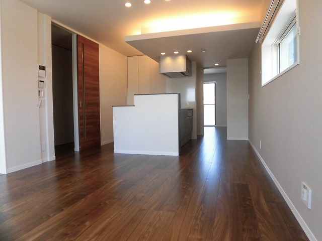 まずリビングは15.4帖の広々空間が広がっています。北側・東側に窓があります。また間接照明やダウンライトでとても落ち着いたいい感じの雰囲気のお部屋になっています。キッチンはIHクッキングヒーター付きのシステムキッチンとなっており、キッチン右手には収納スペースもあり使い勝手も良さそうです。さらにキッチン前カウンターがあるのですが、ワークスペースとして利用しやすそうな空間です。勉強や仕事するのにちょうどいいスペースです。