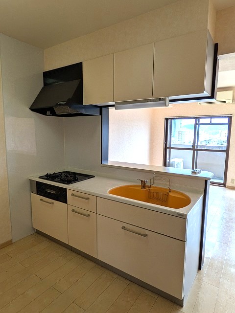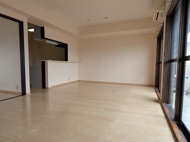 まずリビングは20帖の広さがあり、とても広々とした空間です。お天気が良ければ日当たりも十分あります。また、キッチンは3口ガスコンロ付のシステムキッチンです。キッチン仕事をしながらもリビングの様子を伺うことができます。