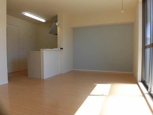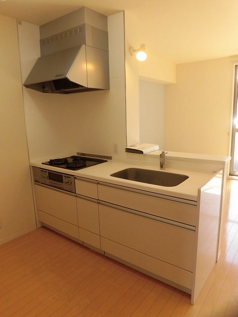 まずリビングは12.1帖の広さです。キッチンは人気の対面式のシステムキッチンです。3口ガスコンロ付きで料理も一度にたくさん調理出来そうです。またキッチンに立ちながらリビングの様子を伺うことができるのもポイントです。