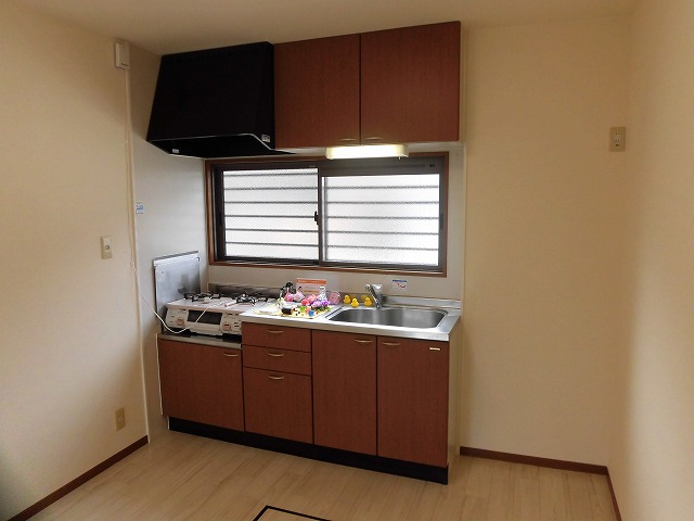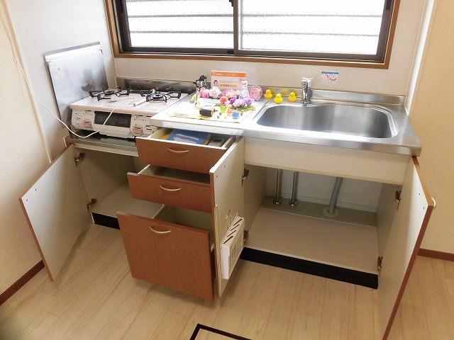 まず、13.5帖のリビングは広々とした印象です。キッチンは壁付けタイプです。2口ガスコンロ付き・床下収納付です。