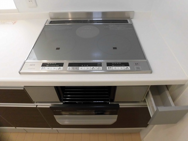 まず、リビングは11.5帖の広さです。西側にも小窓があり午後からも明るいです。キッチンはIHクッキングヒーター付システムキッチンとなっています。スライド収納で使い勝手も良いと思います。またキッチンの左手には扉のついた収納棚があります。食料品などの保存庫としても使えます☆