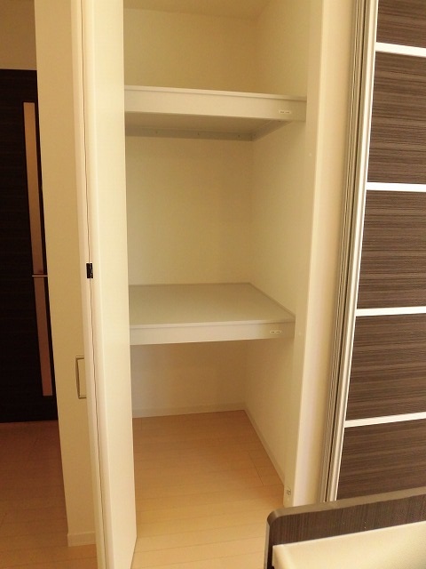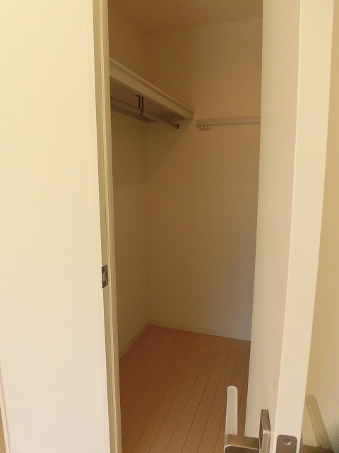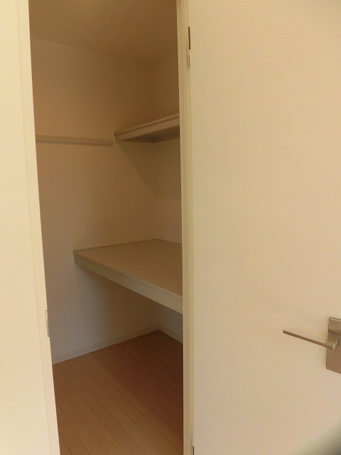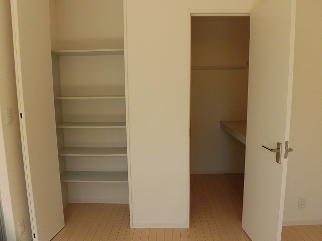 次にリビング横の洋室は6.4帖の広さです。ウォークインクローゼットの収納力は特におすすめのポイントです。さらに仕切り棚のついた収納スペースもあります。こんなに収納力があれば大き目のベッドも置けそうですね(^^♪