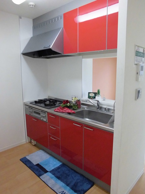 リビングは12.5帖の広さ。南向きでお天気の良い日は日当たりが良いです。キッチンは3口のガスコンロ付き、グリルもあるシステムキッチンです(*´∀`*)。また、リビング入ったところのキッチン横の収納棚は食品庫として、キッチン用具をおいたりも出来そうな場所です。